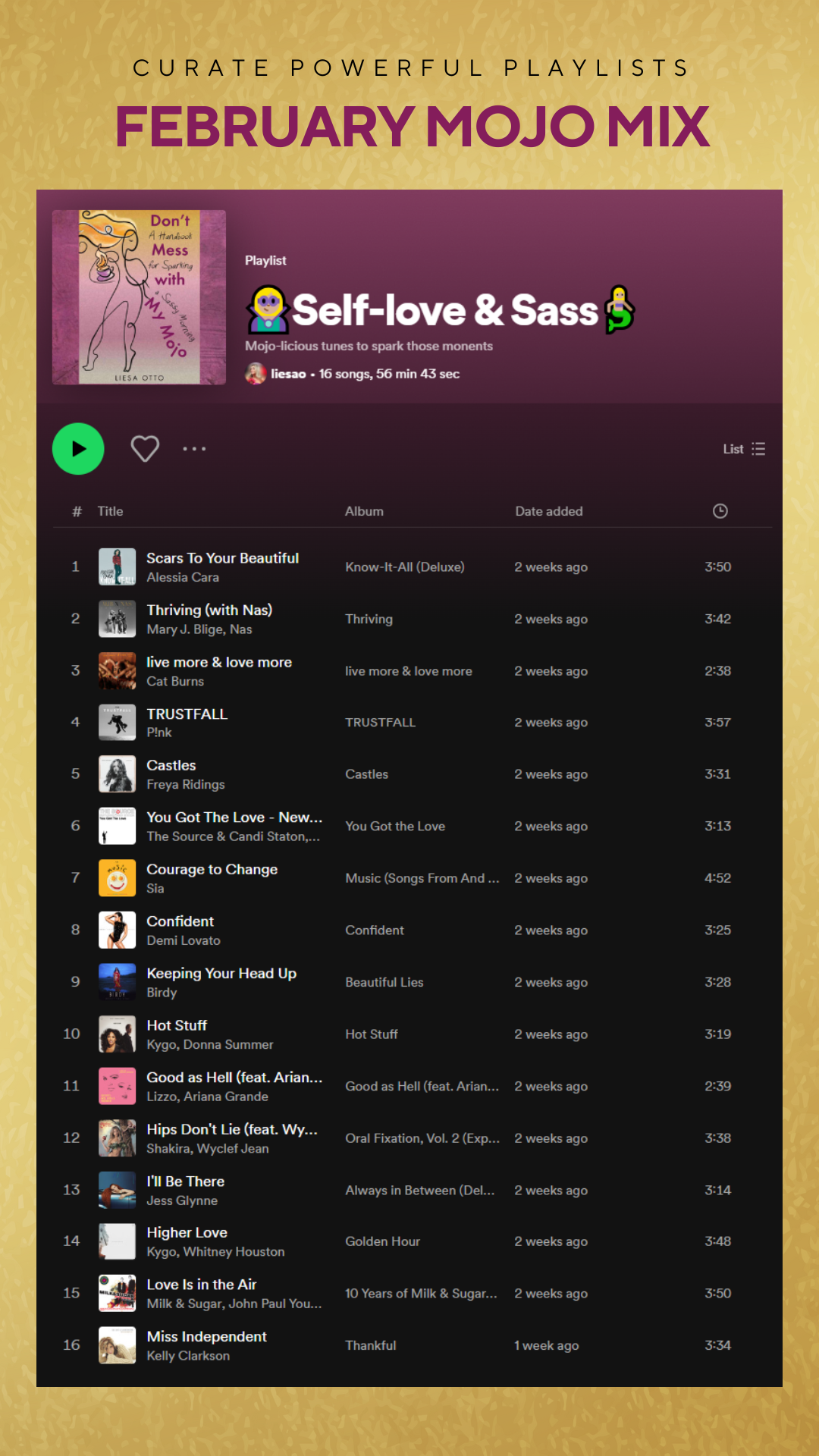 I've curated playlisted based on audio from a month of reels, reliving my content creation journey. In the healing process after losing my mum, a mix of her favorites became a cathartic journey. Now, with Don't Mess With My Mojo around the corner, it's all about self-love and girl power! The fem tunes I handpicked in the Self-love & Sass, on Spotify, echo the power of MOJO. Try syncing your playlist theme with your mood, focus, and life's moments.